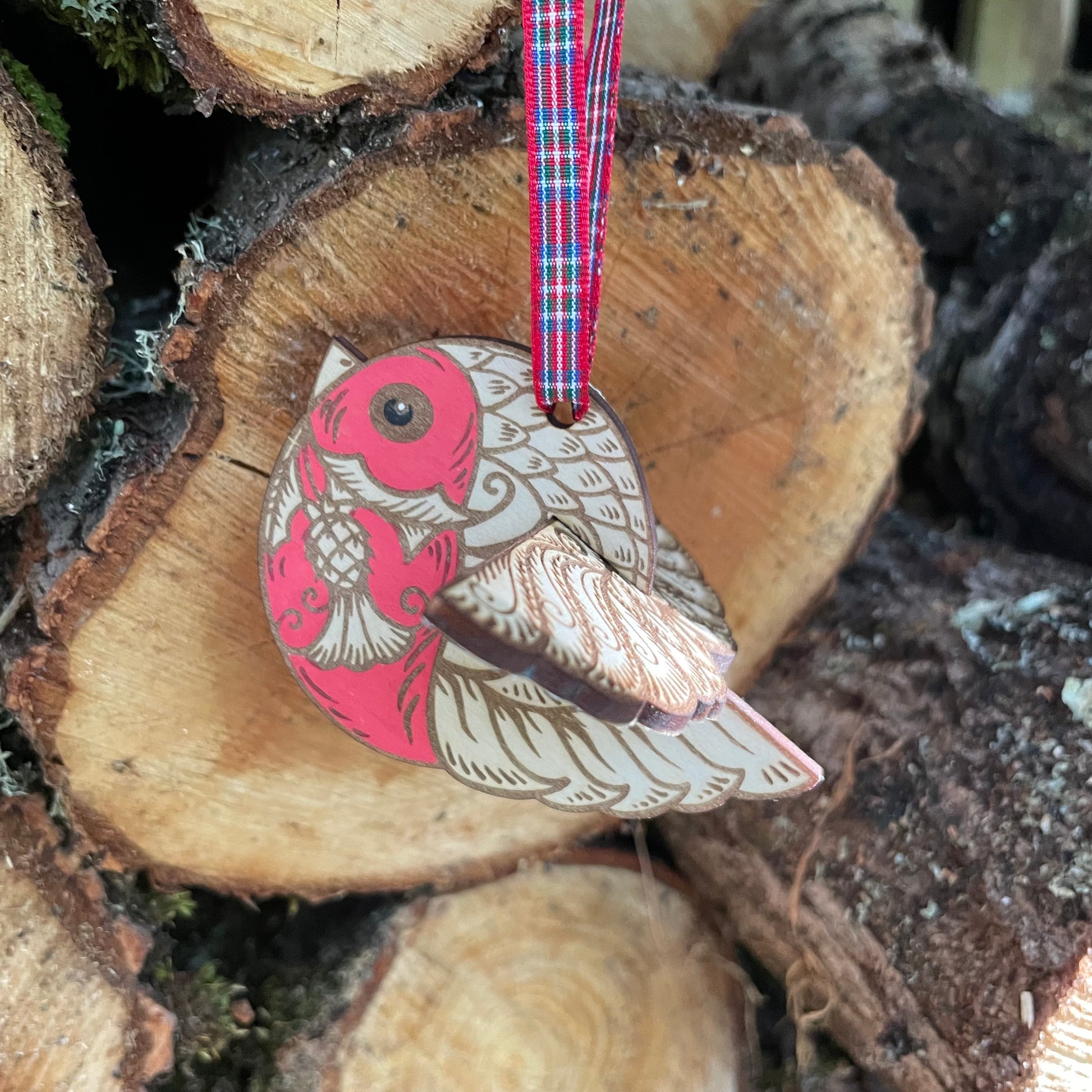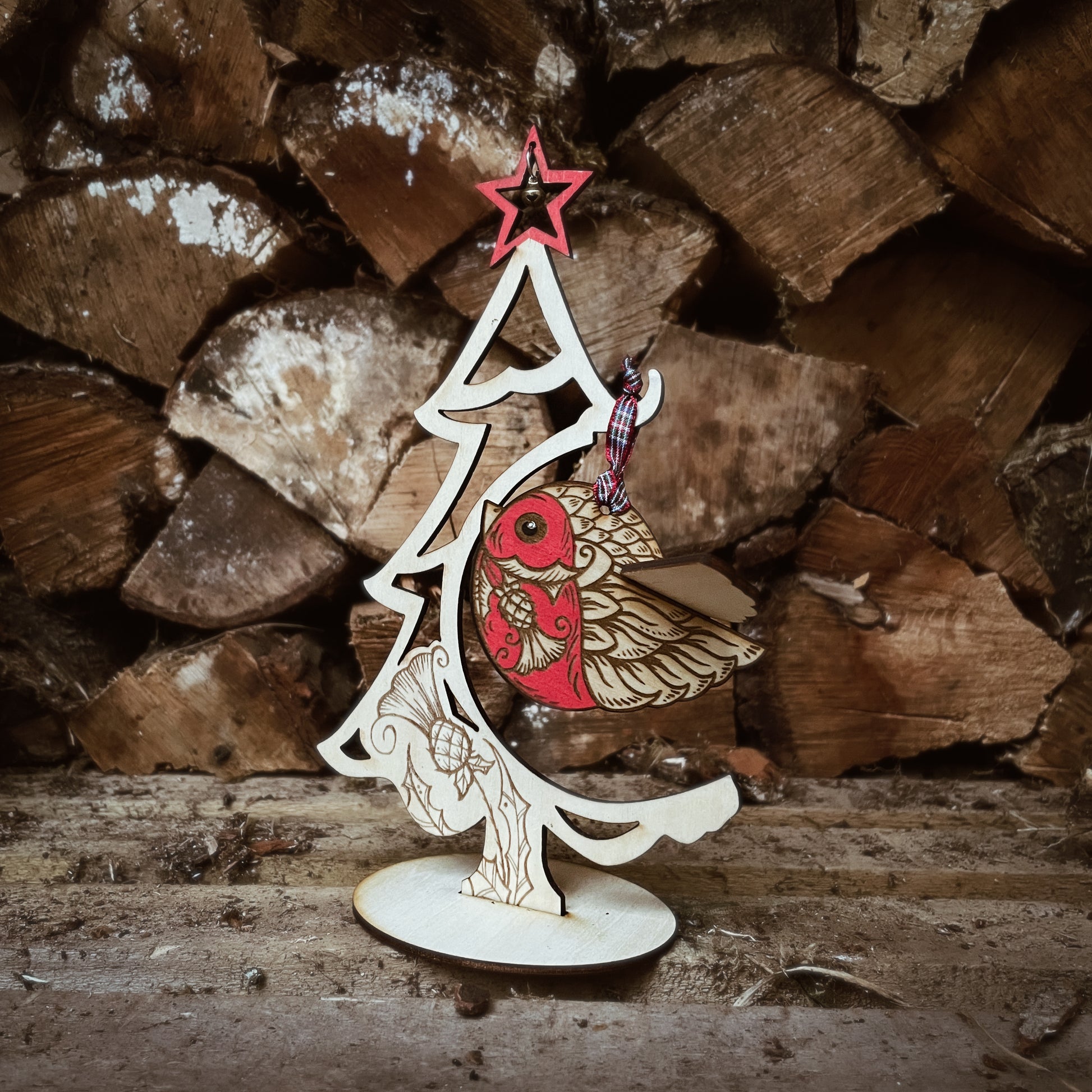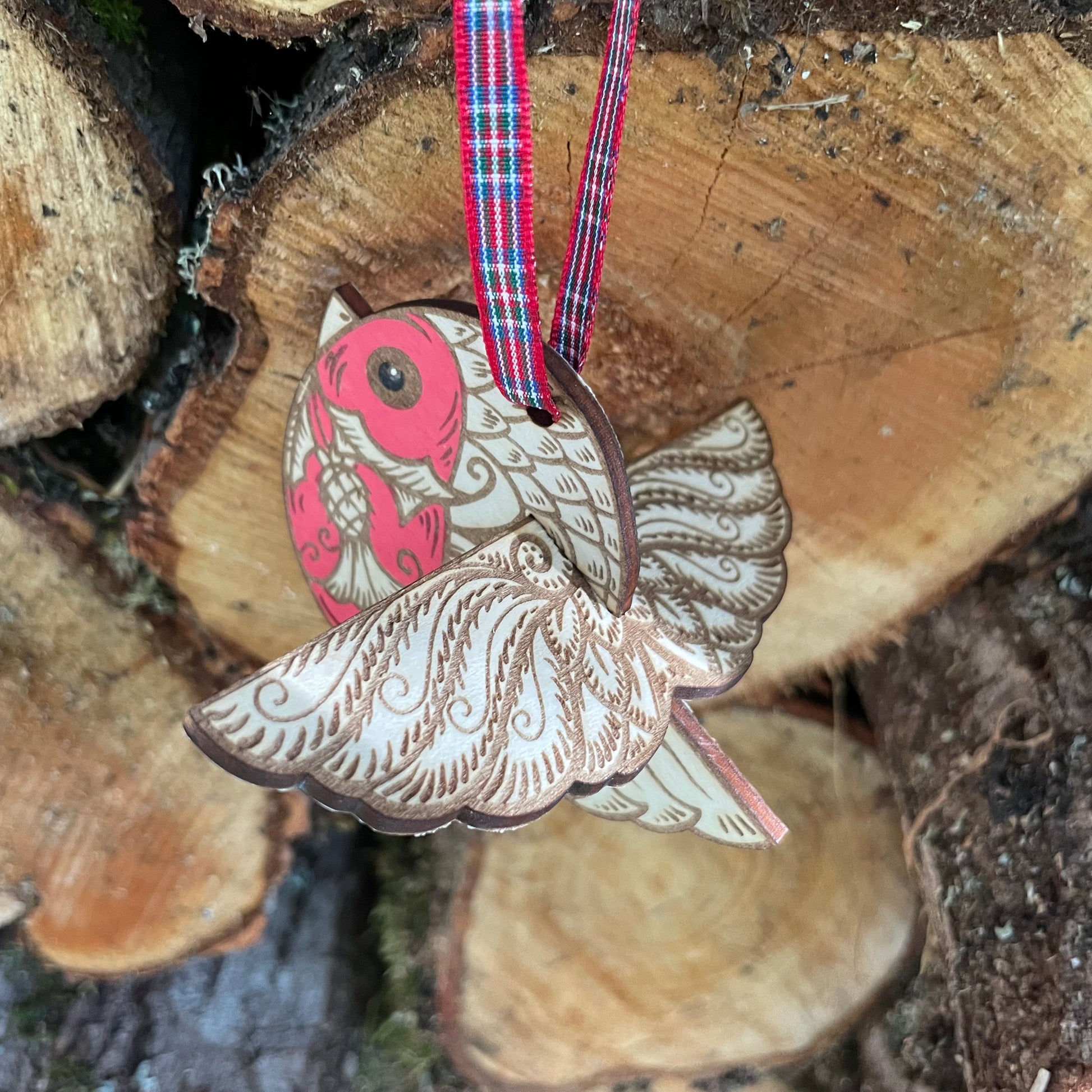 This wee Bob is made from laser engraving and cutting my original design in two parts, they pack flat for storage and shipping and fit together neatly so this wee Bob appears to be flying round your tree. Every one is hand finished with a lush red breast, he is an adorable addition to any Christmas tree. He has a wee tag with his poem and comes in his own gift bag.