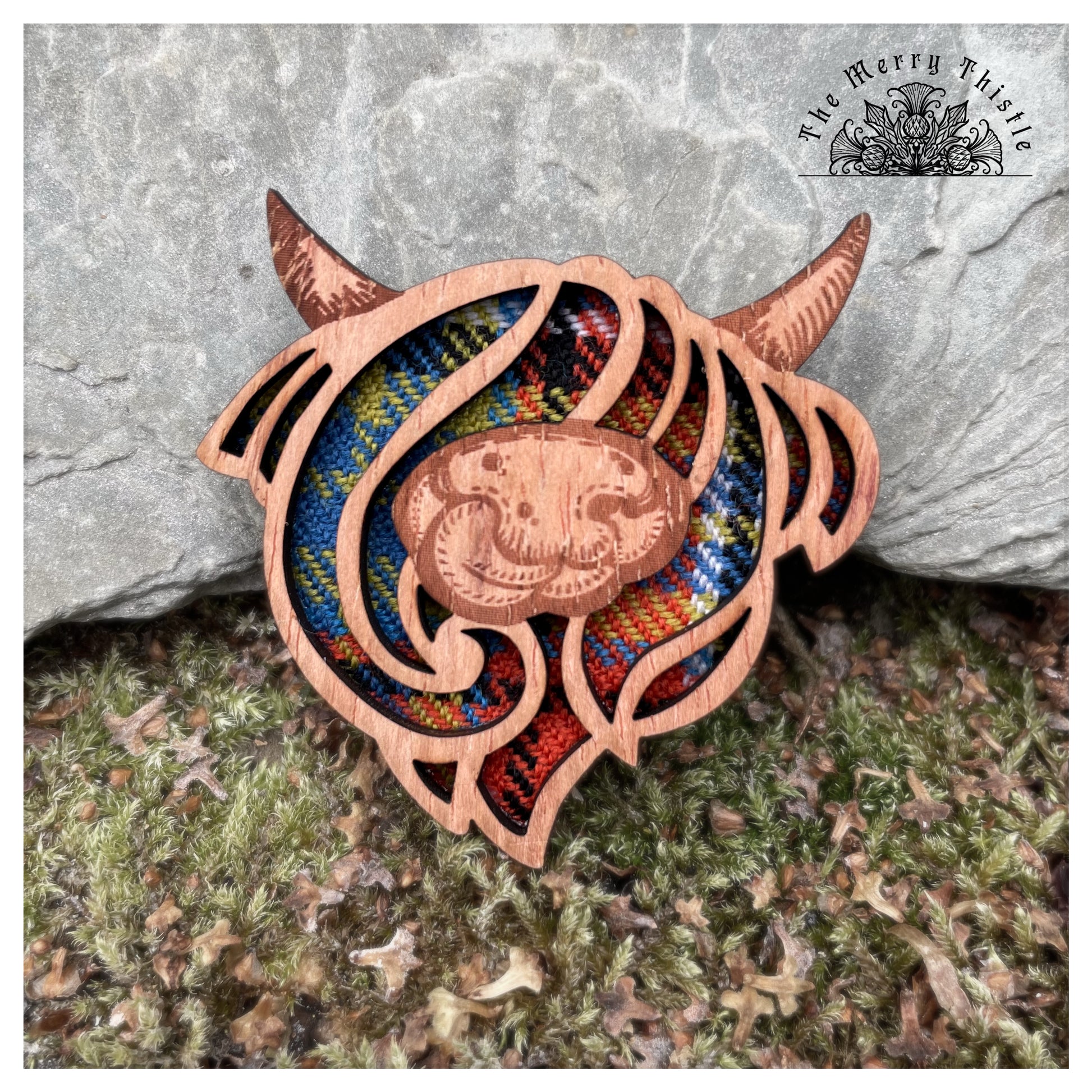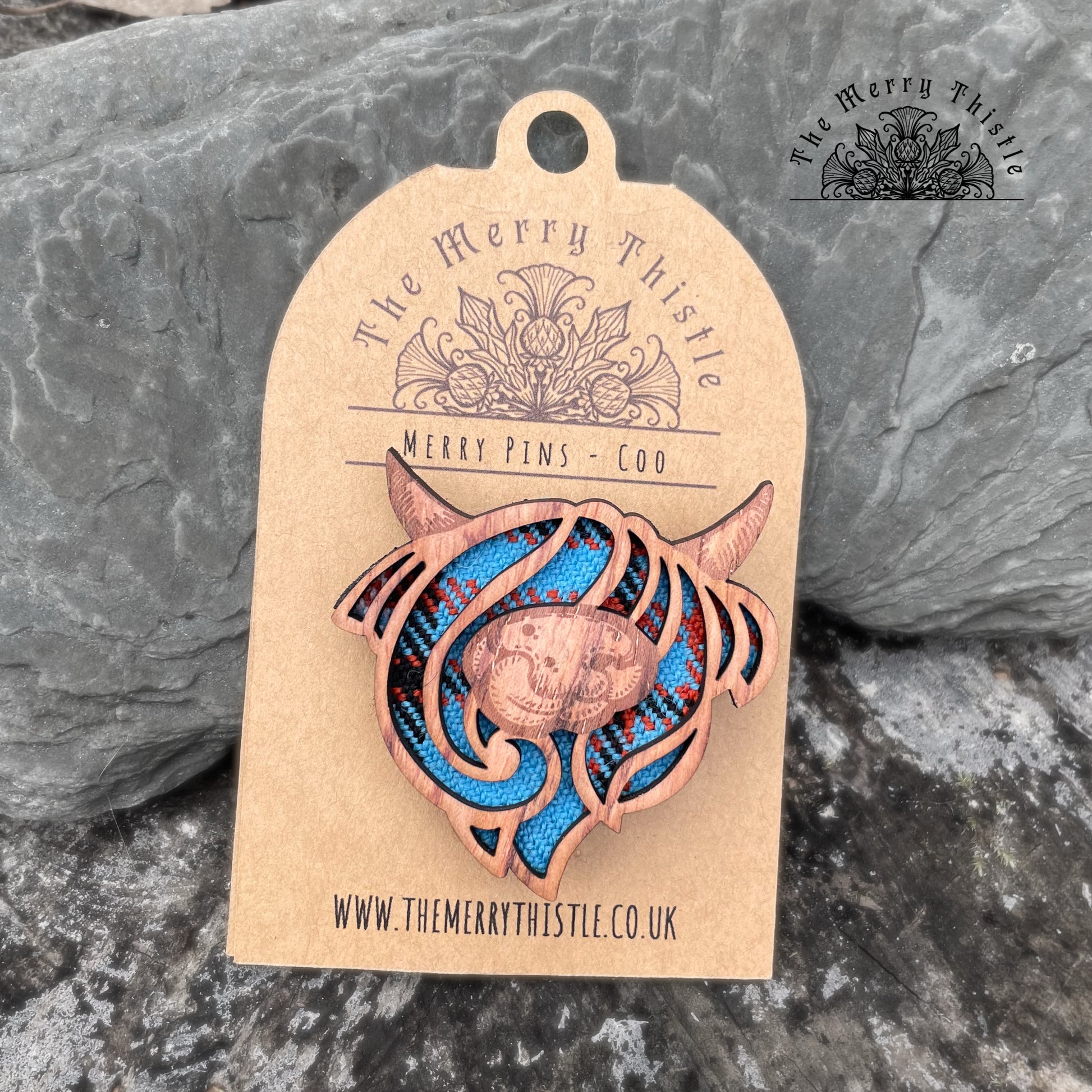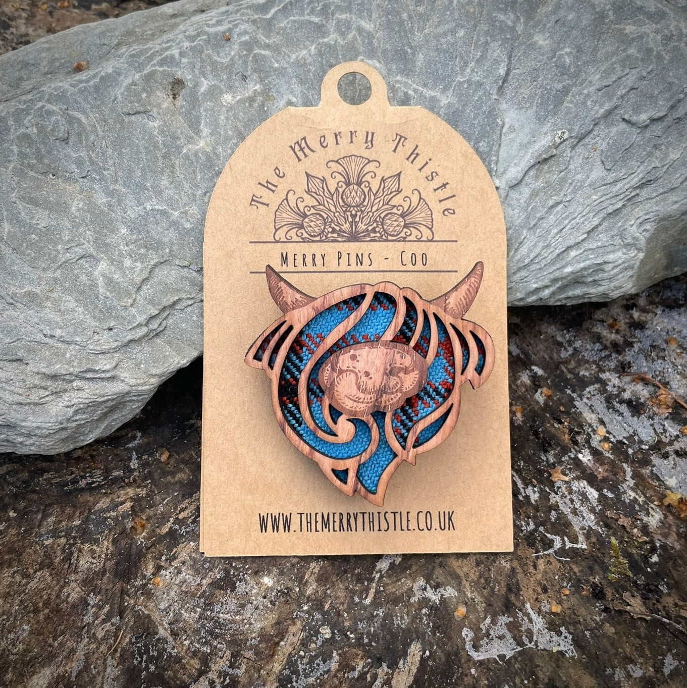 Part of my original #merrypins collection, this cheeky nose licker is laser engraved and cut from quality rustic wood, with a tartan inset, making him as Scottish as it comes! He is mounted on a thick felt back and secured with a brooch pin and mounted on an attractive kraft tag, giving room inside to write a special message. He looks absolutely stunning on a scarf or jacket.