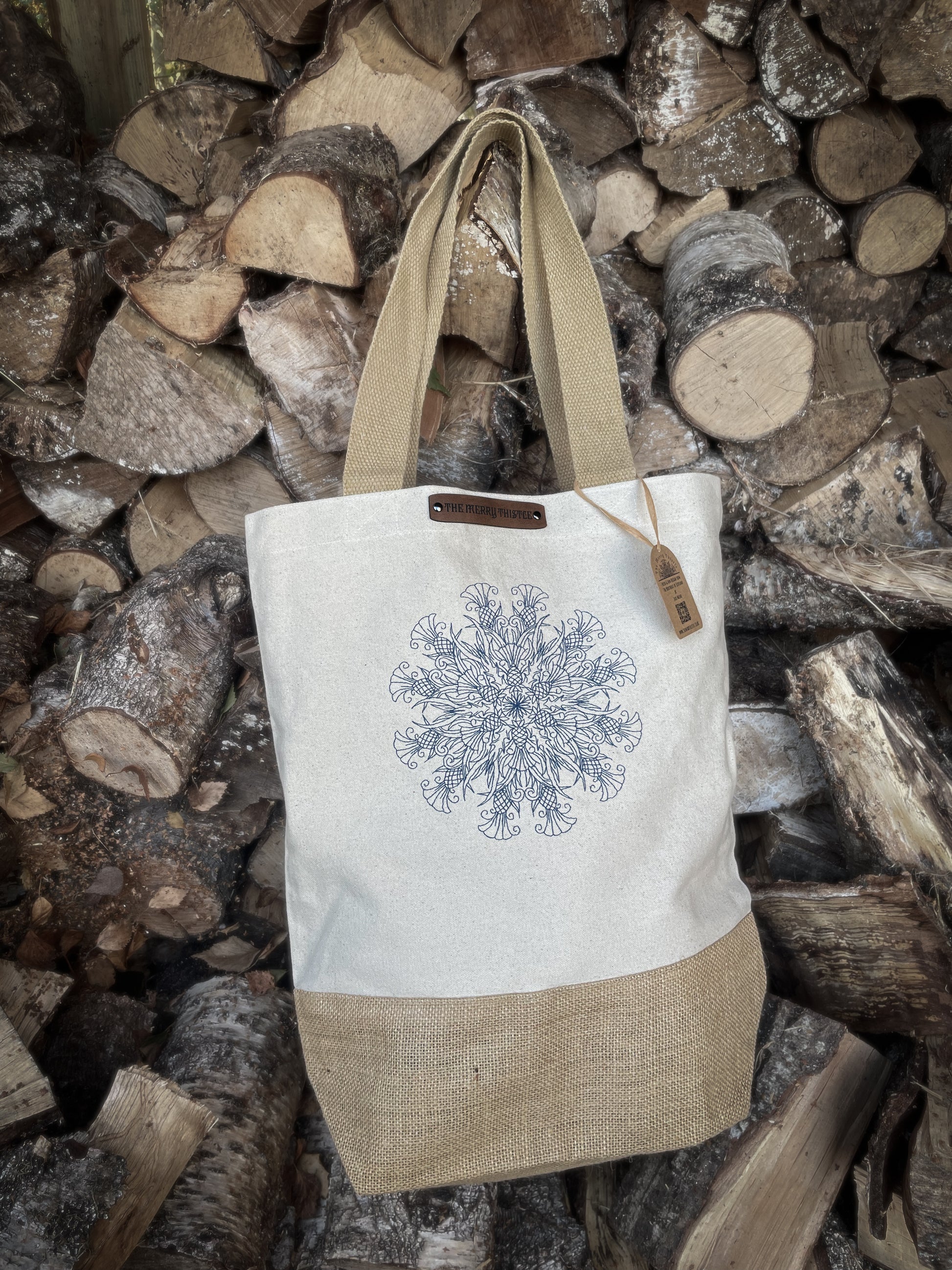 This gorgeous canvas and jute shopper, is robust but stylish. The full thistle mandala, stitched in matt frosted thread, gives a beautiful organic but contemporary feel.